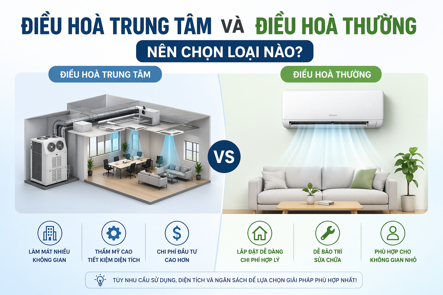 Vị trí và công suất: Lựa chọn máy phù hợp diện tích và lắp đặt tại điểm tối ưu luồng gió, đảm bảo thẩm mỹ không gian.