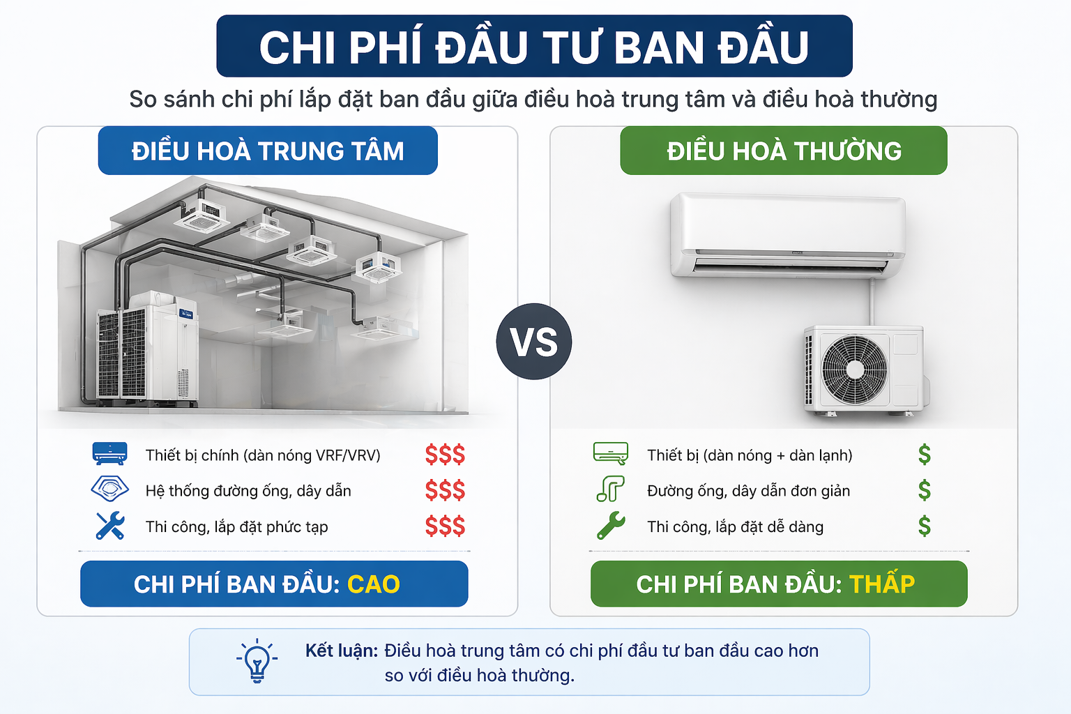 Ngân sách hạn chế hoặc diện tích nhỏ → chọn điều hòa thường. Dự án lớn, dài hạn → chi phí ban đầu của điều hòa trung tâm sẽ được bù đắp qua tiết kiệm vận hành sau 5–8 năm.