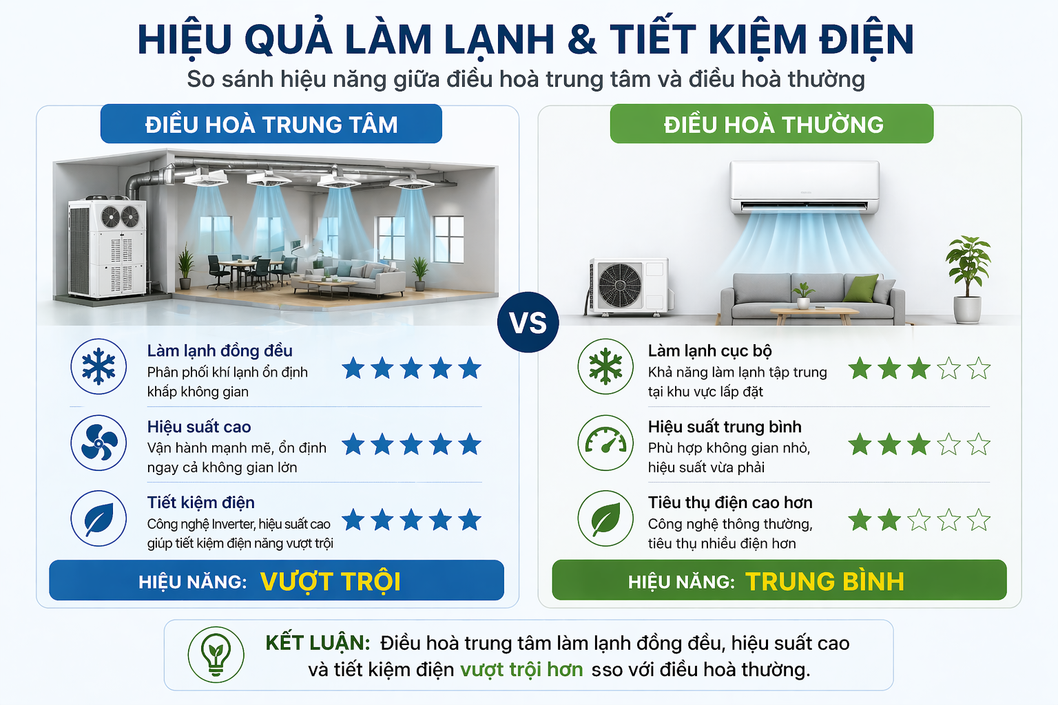So sánh hiệu năng giữa điều hoà trung tâm và điều hoà thường