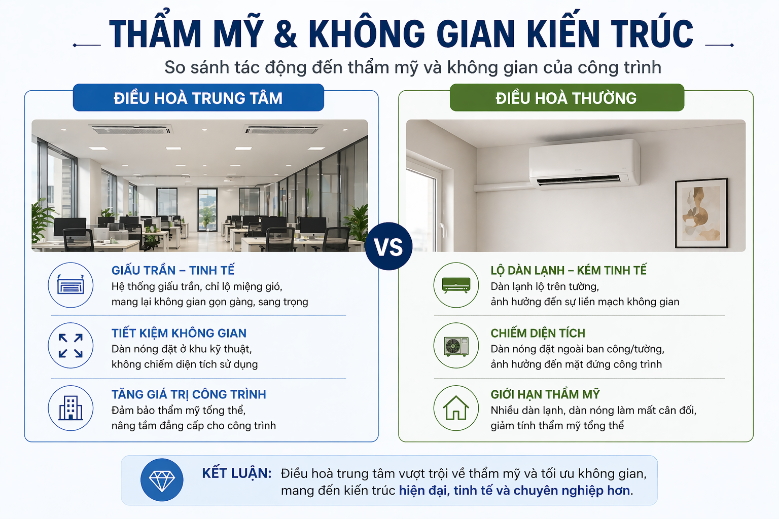 • Điều hòa trung tâm: Tốt hơn về hiệu suất, thẩm mỹ, chất lượng không khí và tuổi thọ — lý tưởng cho công trình lớn và dài hạn.