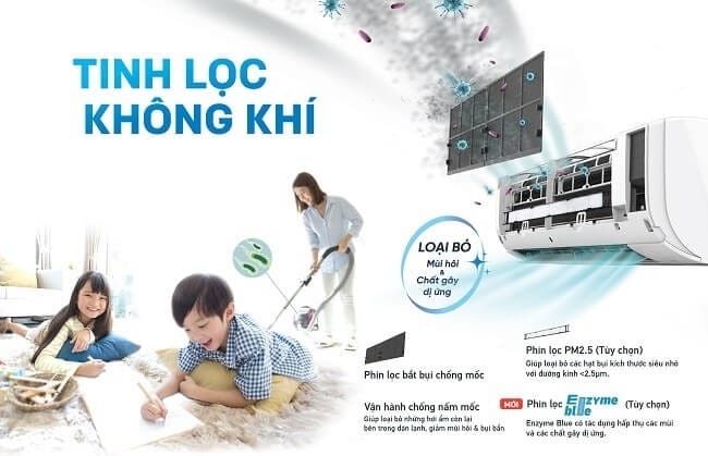 - Phin lọc Enzyme Blue khử mùi: Sử dụng phin lọc Apatit Titan, có khả năng lọc các hạt bụi siêu nhỏ (đường kính <2.5µm). Công nghệ lọc tiên tiến này không chỉ loại bỏ mùi hôi mà còn giúp tiêu diệt nấm mốc và vi khuẩn trong dàn lạnh một cách hiệu quả.